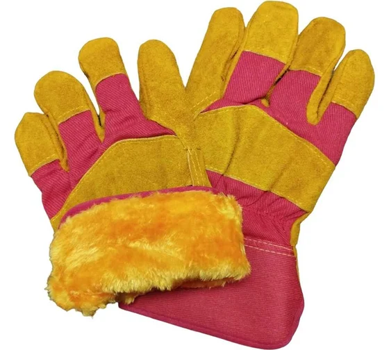 Перчатки спилковые комбинированные утепленные (искусственный мех) желтые с красным