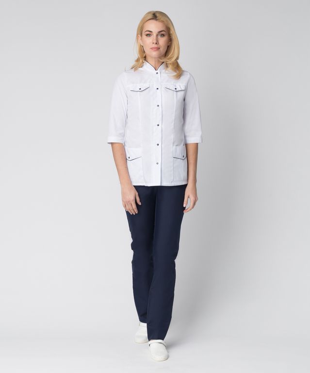 Модная спецодежда для женщин «Орхидея» подчеркивает изящность и утонченный вкус каждой сотрудницы медицинского учреждения, салона красоты, массажного кабинета или стоматологии. Костюм женский рабочий состоит из двух предметов: блуза + брюки женские. Для хранения мелочей предусмотрены боковые карманы с клапанами. Прямые рабочие брюки оснащены поясом на резинке для комфортной работы в течение длительного периода времени. Лаконичный и современный внешний вид костюма обеспечивают контрастный дизайн, нагрудные декоративные карманы и синие канты на воротнике и карманах, идеально гармонирующие с синими брюками.