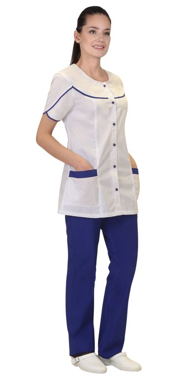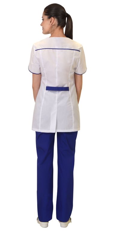 Костюм комбинированный из ткани двух цветов состоит из блузы белого цвета и брюк василькового цвета.
