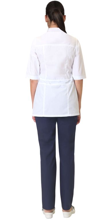 Костюм комбинированный из ткани двух цветов состоит из блузы белого цвета с отделкой и брюк тёмно-синего цвета.