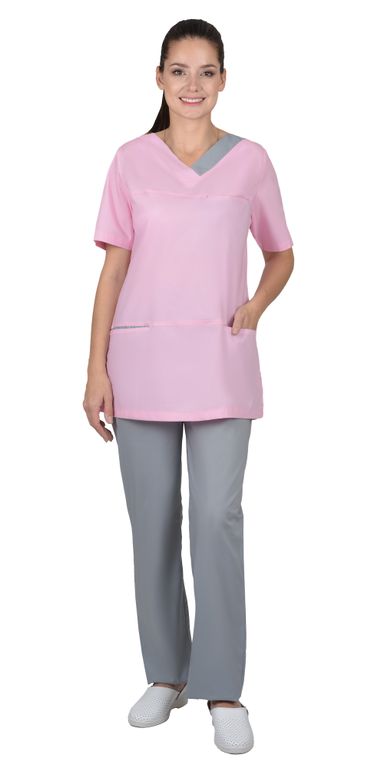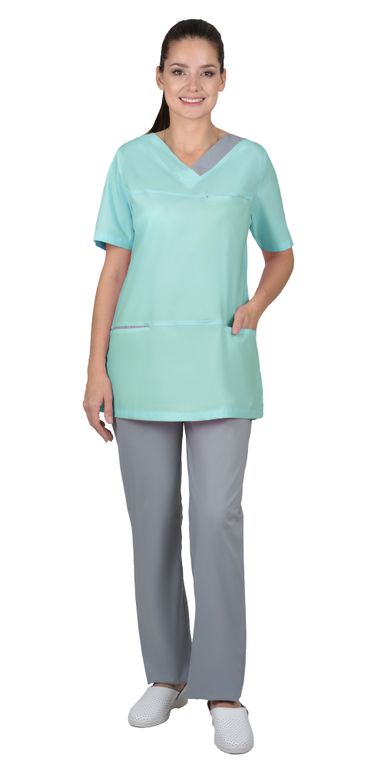 Блуза прямого силуэта, без застёжки, с V – образным вырезом, с нагрудным и нижними горизонтальными карманами в швах, с втачными короткими рукавами, по боковым швам разрезы. Брюки прямые на притачном поясе, частично стянутом на эластичную тесьму, спереди на поясе вставка.