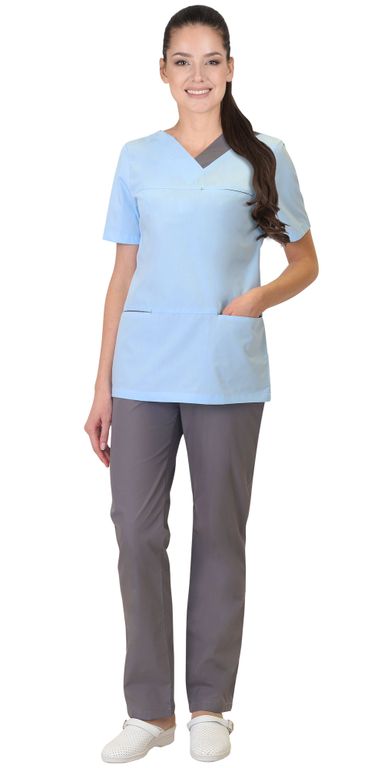 Костюм комбинированный из ткани двух цветов состоит из блузы голубого цвета и брюк темно-серого цвета.