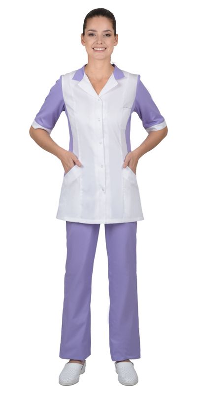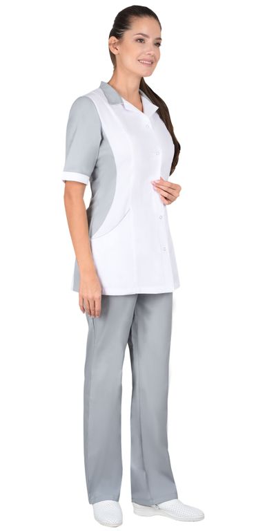 Костюм состоит из блузы и брюк. Блуза полуприлегающего силуэта, с центральной застёжкой на рубашечные кнопки. Воротник отложной с лацканами. На полочке расположены верхний накладной и нижние внутренние фигурные карманы. Рукава втачные, укороченные с манжетами. Детали блузы выполнены из отделочной ткани в цвет брюк. Брюки прямого силуэта, с застёжкой гульфика на тесьму «молния». Пояс притачной, застёгивающийся на петлю и пуговицу. Ширина пояса регулируется эластичной тесьмой в области боковых швов.