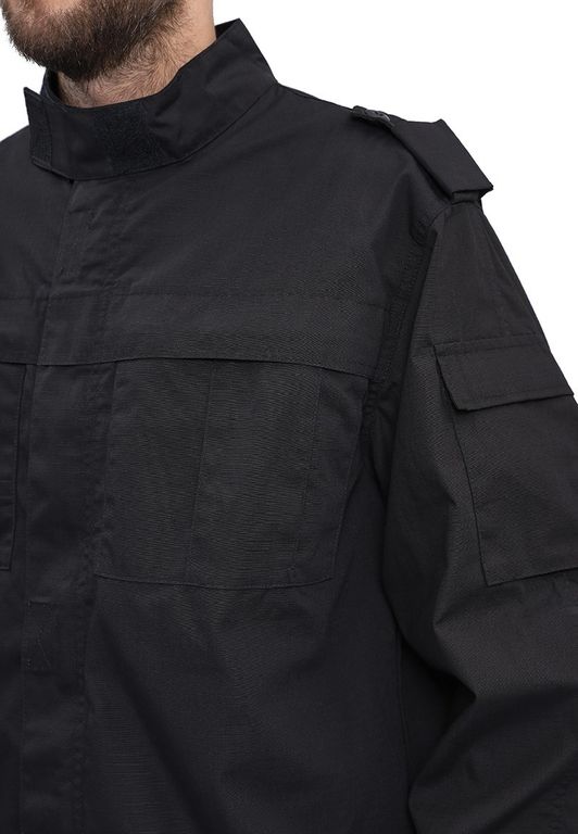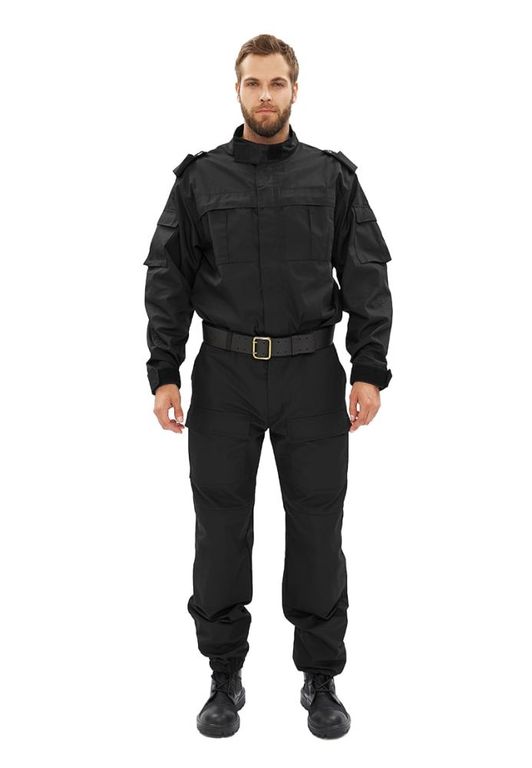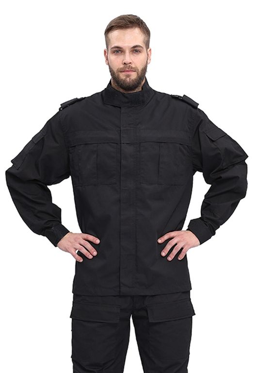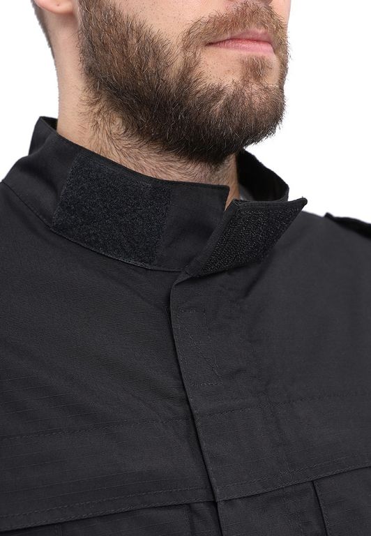 Куртка прямого силуэта удлиненная, фасон предполагает возможность заправить куртку в брюки. Центральная застежка на молнию с планкой на липучках; два нагрудных объемных накладных кармана со складками на молнию под отлетным краем кокетки; погоны на пуговице; спинка со складками до линии талии для свободы движения; рукава на манжете с патой на широкой липучке; воротник стойка с патой на липучке; внутренний навесной карман на липучке.