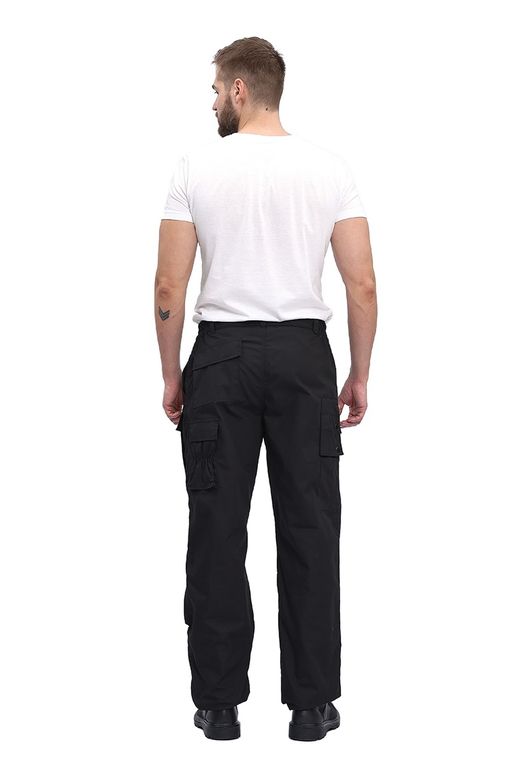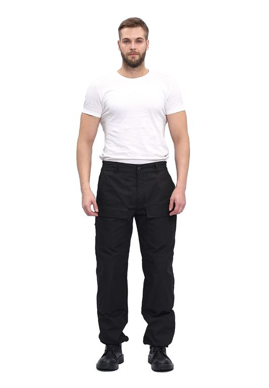 Брюки прямые, свободного кроя, с широким поясом, стянутым боковыми резинками, со шлевками и пуговицей; застежка – гульфик на молнии; на правой задней половинке брюк карман-патронташ с клапаном на кнопках; усилительные накладки в области колена.