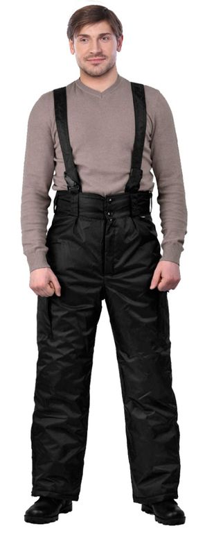 Брюки утепленные, прямого силуэта, на широком поясе, увеличенным по высоте со стороны спинки, со шлевками, на бретелях с резинкой и фастексами. Застежка-гульфик на молнии и пуговицами на поясе. По боковым сторонам объемные накладные карманы с клапаном на кнопках. Ширина по низу брюк регулируются с помощью паты на кнопках. Подкладка простеганна с утеплителем.