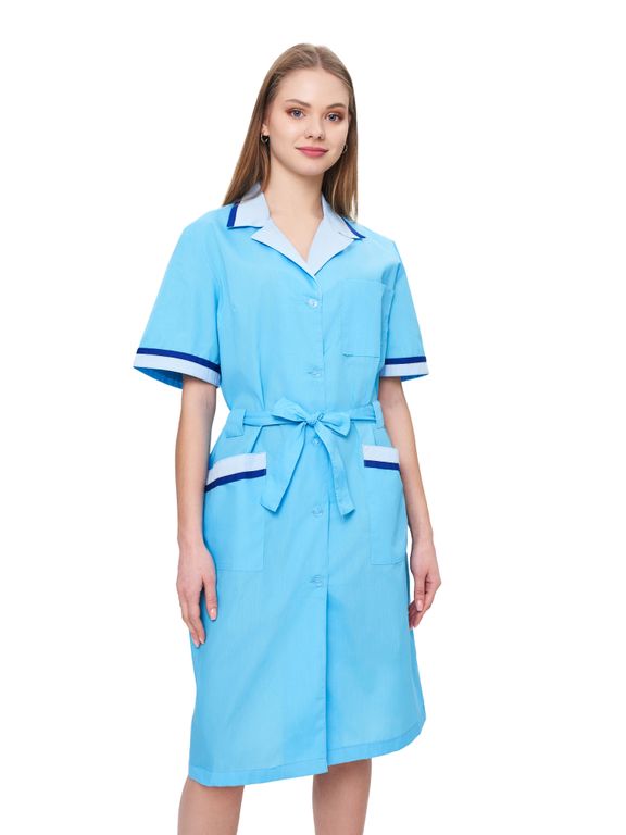 - Воротник: отложной с контрастной отделкой светло-голубого/василькового цвета.