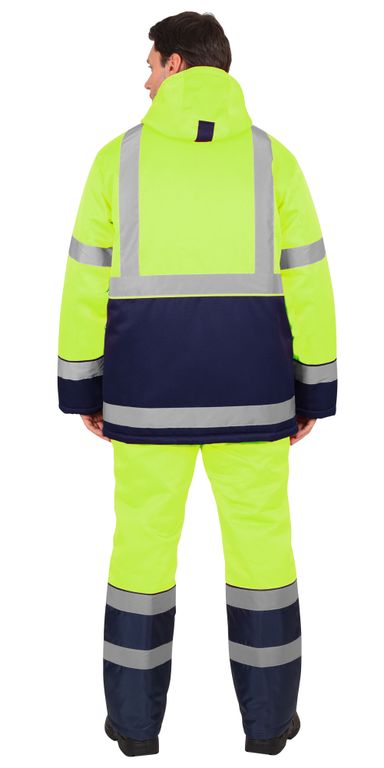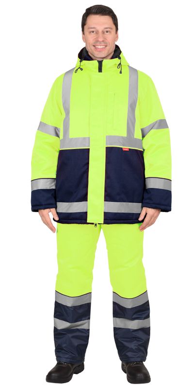 Куртка прямого силуэта; с притачной утеплённой стеганой подкладкой, с центральной застёжкой на двухзамковую тесьму - «молнию» и ветрозащитной планкой застегивающейся на потайные текстильные застежки «липучка» 4 шт., с втачным утепленным капюшоном. По полочкам, спинки в области груди, талии, низа и низа рукавов настрачивается СОП 50 мм для обозначения сигнальной видимости.
