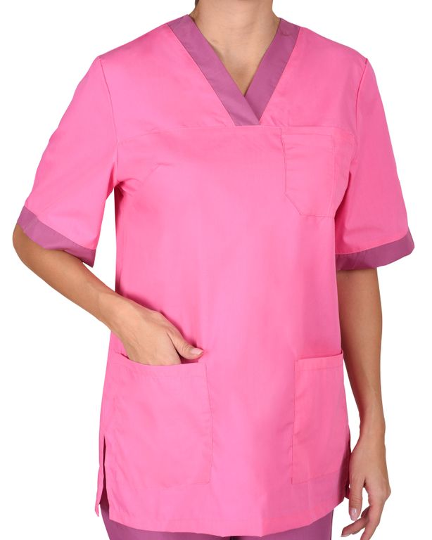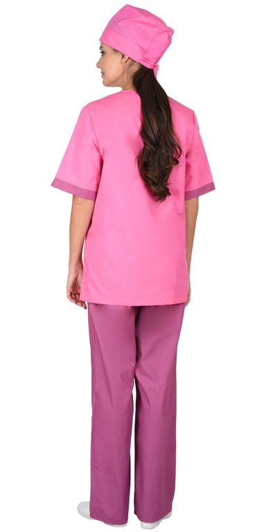 Костюм состоит из блузы, брюк и колпака. Блуза прямого покроя с V-образным вырезом горловины. На полочке один верхний и два нижних накладных кармана. Рукава короткие. Вырез горловины и манжеты рукавов из контрастной ткани. Брюки прямого покроя на резинке. Колпак одноцветный с отворотом.