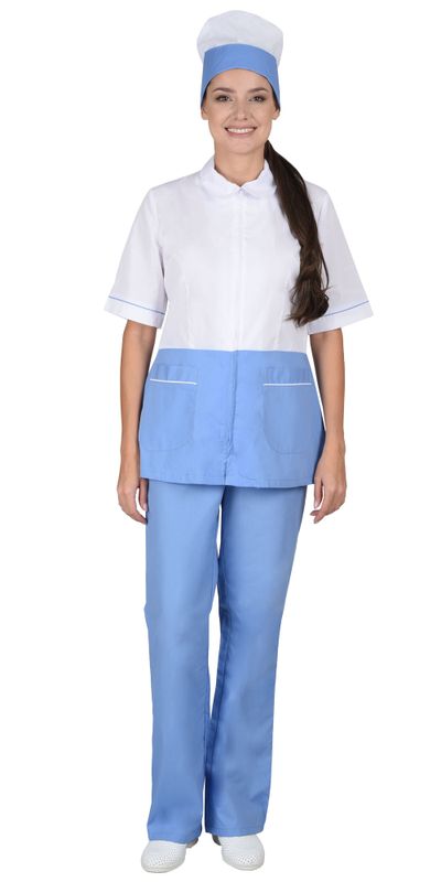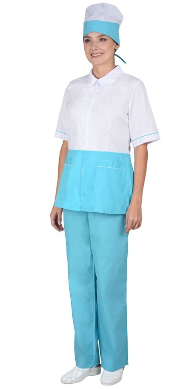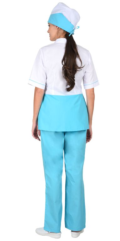 Костюм состоит из блузы, брюк и колпака. Блуза с центральной застежкой на молнию, в боковых швах центральные разрезы для удобства. Рукава и карманы с отделкой в виде канта контрастного цвета. Брюки прямого покроя на резинке. Колпак с фигурной отделкой.