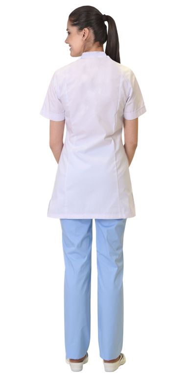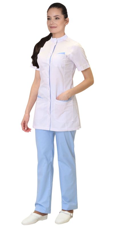 Костюм состоит из блузы и брюк. Блуза полуприлегающего силуэта, с центральной сквозной бортовой планкой, застегивающейся на рубашечные кнопки. Воротник «стойка». Рукава втачные, короткие с цельнокроеными манжетами. Полочка с одним верхним и двумя нижними накладными карманами. По верхнему краю карманов выполнена имитация платочка из отделочной ткани в цвет брюк. Брюки прямого силуэта, с заниженной талией, с застежкой гульфика на тесьму "молния", притачным поясом, застегивающимся на пуговицу, частично стянутым резинкой по боковым сторонам.