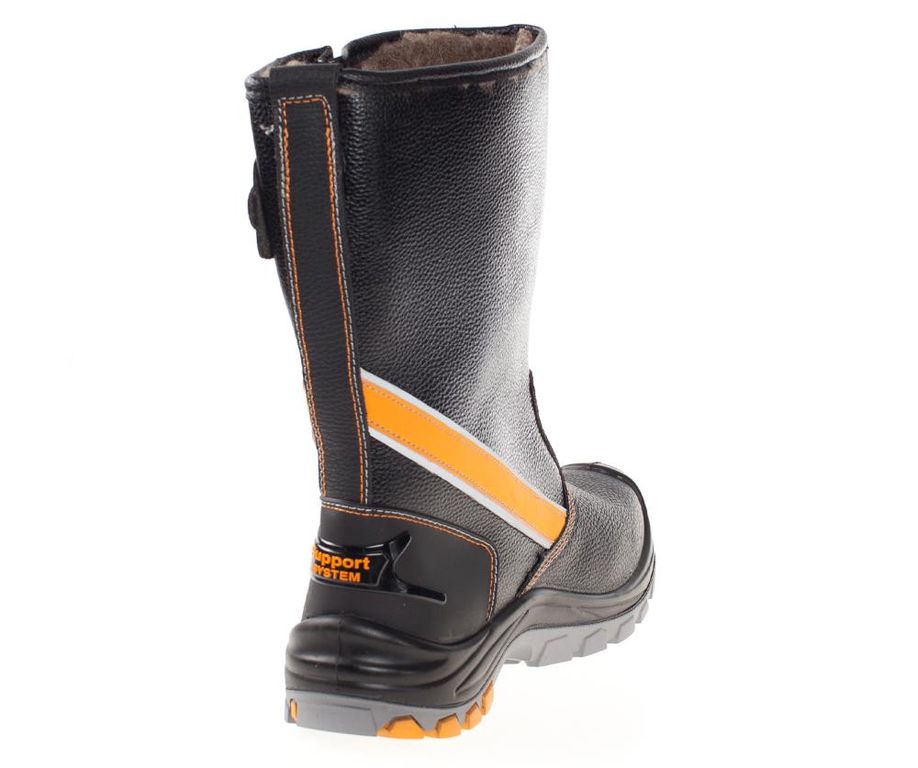 Верхняя часть обуви выполнена из термоустойчивой и водоотталкивающей кожи (юфти) толщиной от 1,8 до 2,0 мм. Подошва – двухслойная, устойчивая к воздействию нефти, нефтепродуктов, щелочей концентрации до 20%, повышенных температур. Голенище выполнено из искусственной кожи. Верхний слой из полиуретана обладает амортизирующими свойствами, гасит ударные нагрузки, а также придает обуви легкость, комфортность и повышенные теплозащитные свойства. Ходовой слой изготовлен из износостойкой, термостойкой (+300°С / 60 с), морозостойкой резины на основе нитрильного каучука с улучшенным сопротивлением скольжению, стойкостью к деформациям, истиранию. Носочная часть имеет дополнительную защиту в виде полиуретановой накладки, предотвращающей механические повреждения обуви и препятствующей проникновению холода.