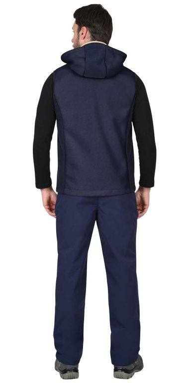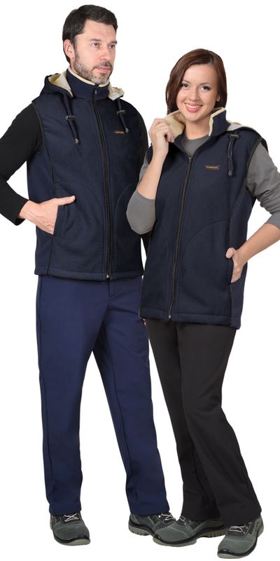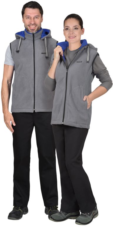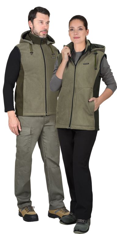 Жилет из дублированного флиса, без подкладки, прямого силуэта, с втачным воротником стойка, со съёмным капюшоном, со сквозной центральной, бортовой застёжкой на молнию, с отрезными бочками, с нижними боковыми карманами в рельефе. Пройма окантована резинкой ш.25 мм.