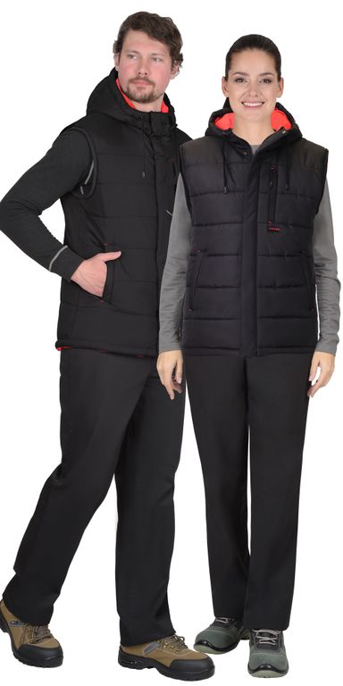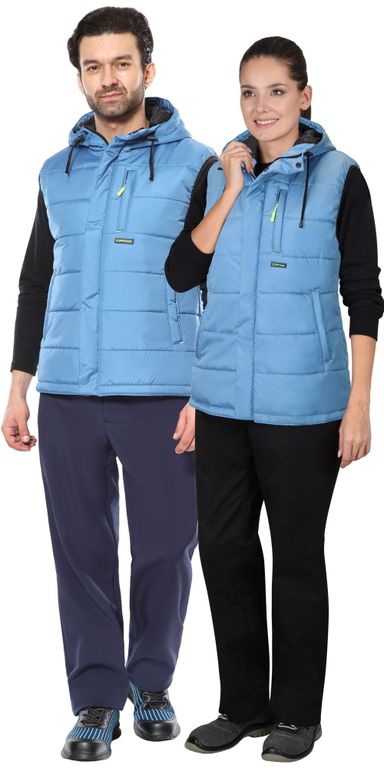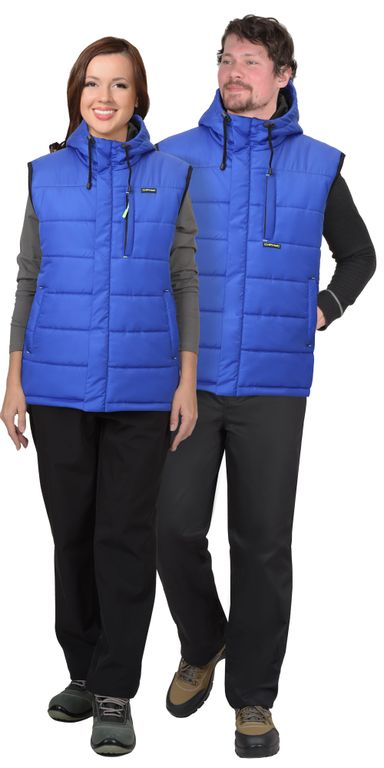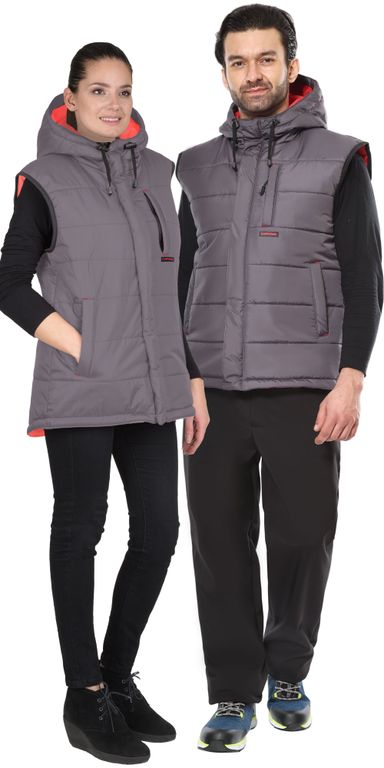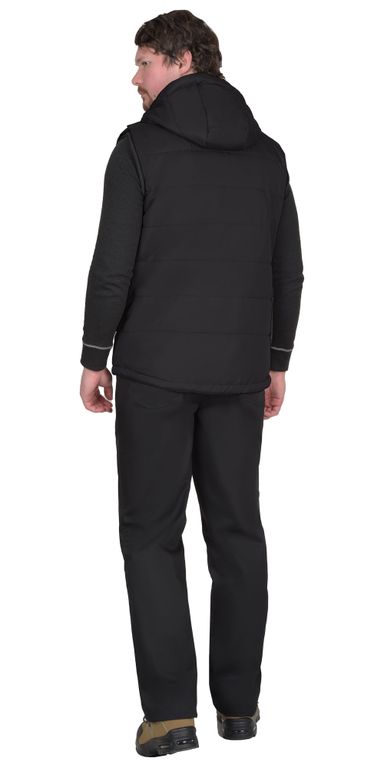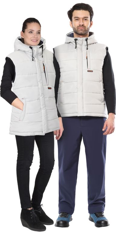 Жилет утеплённый, стёганный, на подкладке, с втачным капюшоном, с центральной застёжкой на молнию, закрытую ветрозащитным клапаном от края капюшона до низа изделия, застёгивающимся на кнопки. Жилет с одним нагрудным карманом с молнией и двумя нижними карманами. Спинка жилета, удлинённая с фигурной линией низа. Пройма окантована резинкой. Объём капюшона по лицевому вырезу регулируется шнуром с фиксаторами.