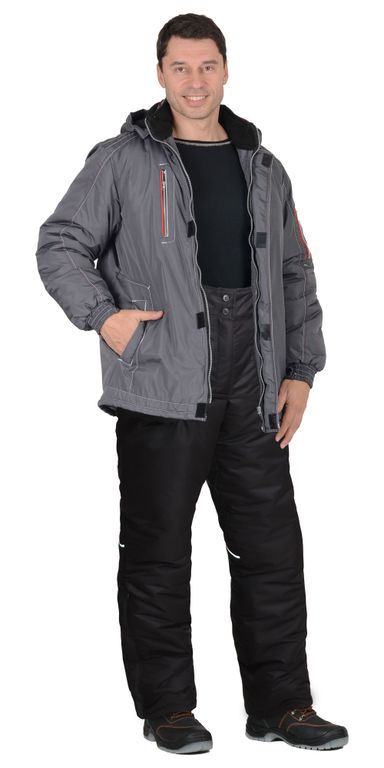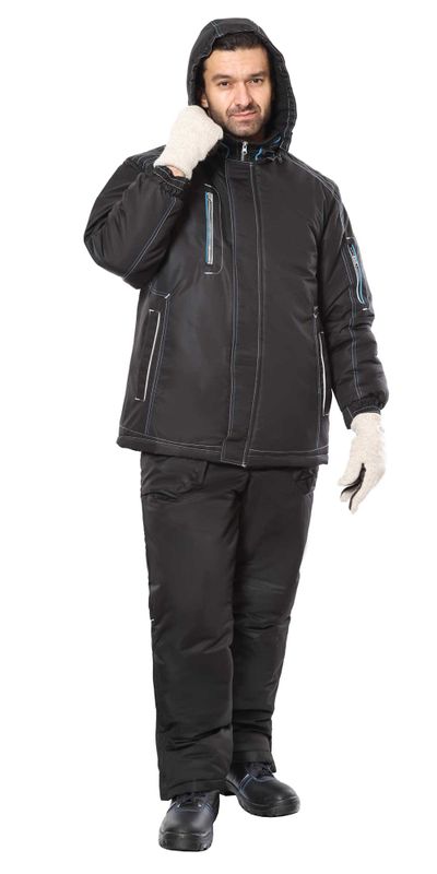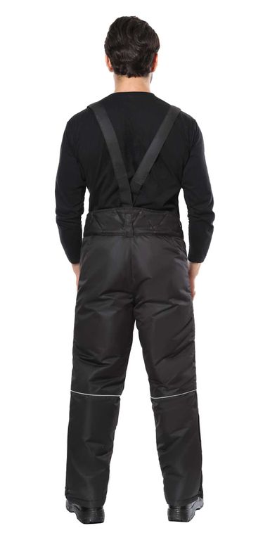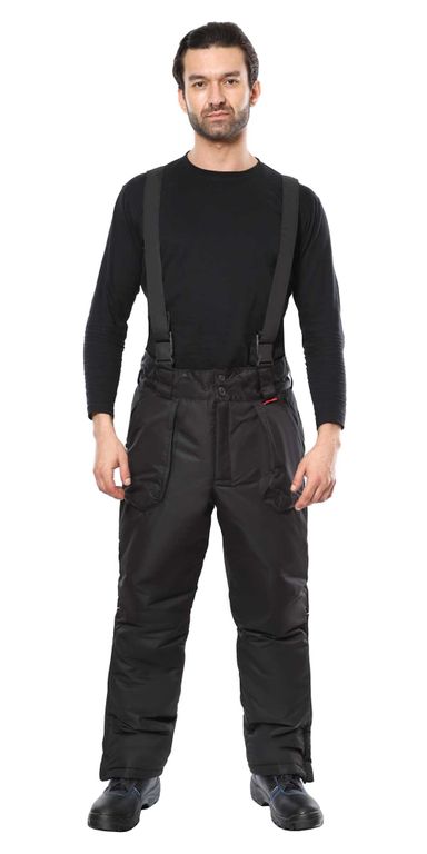Брюки прямые на утеплённой подкладке, с застежкой спереди на молнию – гульфик. Брюки с широким поясом с застежкой на 2 пуговицы, со съёмными бретелями. Бретели пристегиваются к брюкам при помощи пуговиц и петель, регулируются по длине. По боковым швам внизу разрез с молнией. В брюках на задних половинках предусмотрен кант СВМ 3мм 100К для обозначения сигнальной видимости.