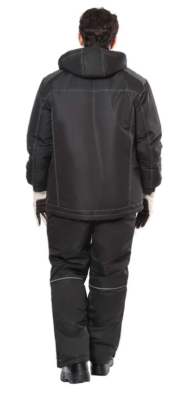 Куртка длинная, прямого силуэта, с притачной утеплённой подкладкой и съёмным капюшоном, с воротником-стойка, с центральной бортовой застёжкой на молнию, с ветрозащитной планкой застегивающейся на липучке и с подпланкой. Рукава втачные с манжетами, частично стянутыми на резинку.