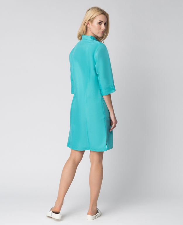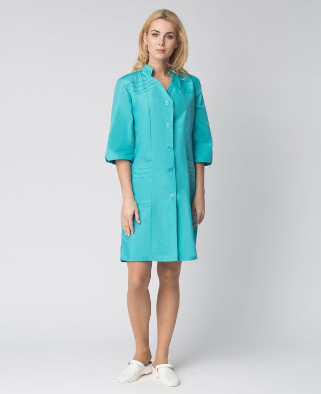 Медицинский халат изготовлен в соответствии с ГОСТ, надежно защищает от общих производственных загрязнений и прекрасно подходит для работы в салонах красоты, медицинских учреждениях, массажных салонах и стоматологиях. Благодаря воротнику-стойке и декоративной отделке карманов и кокетки женская спецодежда выглядит элегантно и женственно. Короткий женский халат полуприлегающего силуэта великолепно сидит по фигуре, подчеркивает линию талии. С помощью центральной застежки халат легко надевать, а рукава 3/4 не мешают работе.