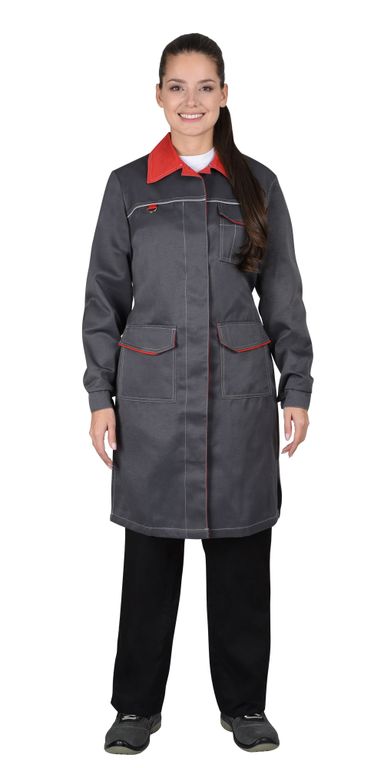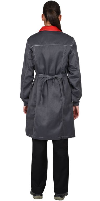 Халат с центральной потайной застёжкой на 5шт. обметанных петель и 5шт. пуговиц; с воротником пиджачного типа; с левым нагрудным накладным карманом с фигурным клапаном; нижними накладными карманами с фигурными клапанами, в боковых швах с поясами завязывающимися в свободный узел и разрезами понизу. Рукава втачные двухшовные с притачными манжетами.