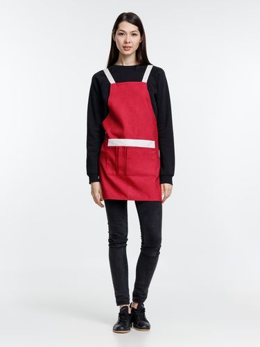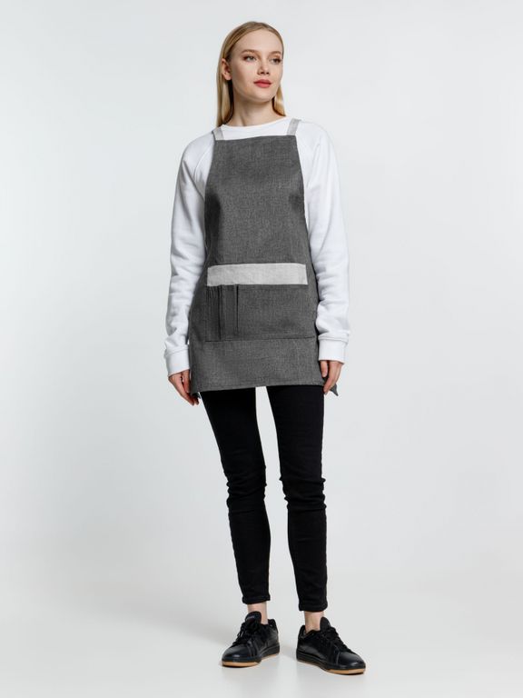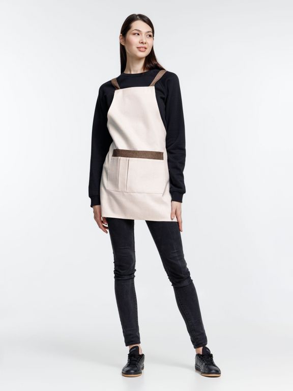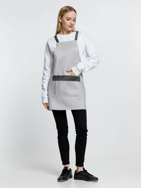 Фартук с контрастной отделкой и перекрестными регулируемыми лямками.