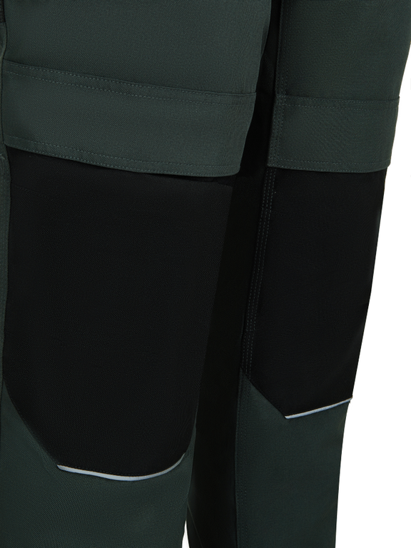 Брюки имеют множество карманов, которые позволяют удобно хранить необходимые инструменты и мелочи, возможность вставки наколенников обеспечивает дополнительную защиту коленей при работе, манжет внутри штанины защищает ноги от попадания снега в ботинок.