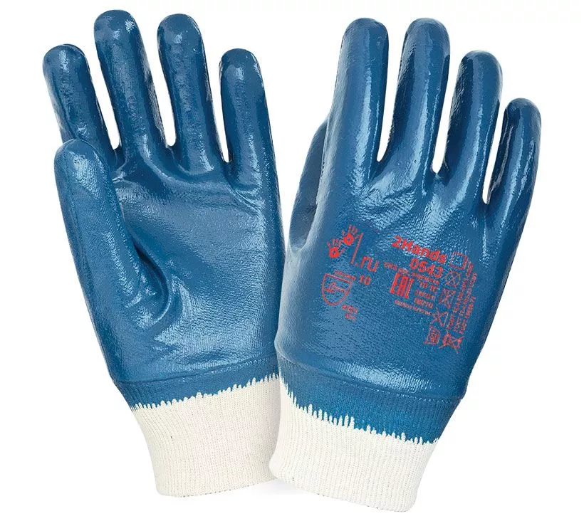 Перчатки с тяжелым нитриловым покрытием 2Hands (Ту Хэндс) 0543 для защиты от механических воздействий. 100% хлопковая основа jersey (джерси) с полным нитриловым покрытием ладони и пальцев, манжет трикотажная резинка.