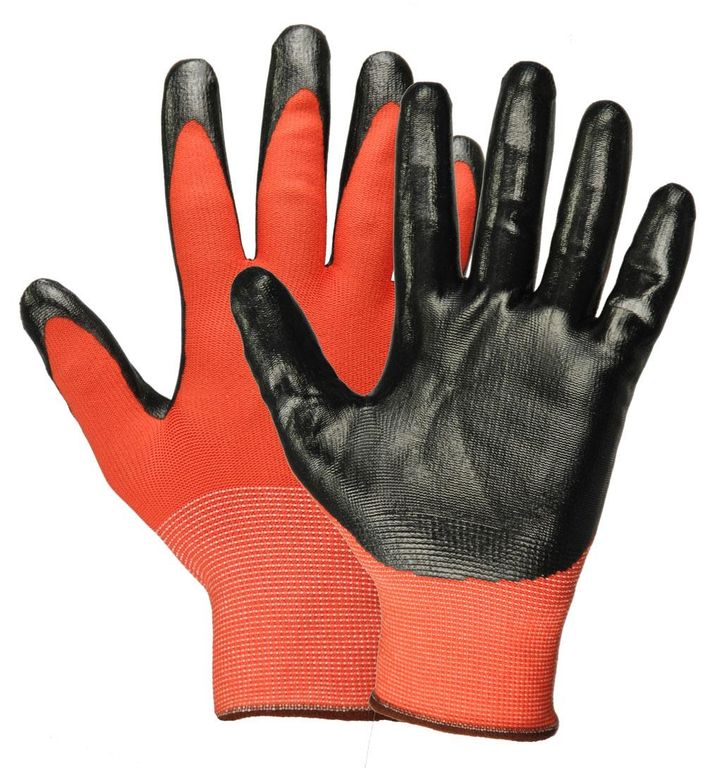 - нитриловый облив надежно защищает руки от ссадин, царапин, порезов, а также воздействия агрессивных веществ (масел, нефтепродуктов, слабых растворов кислот и щелочей) при попадании на ладонь.