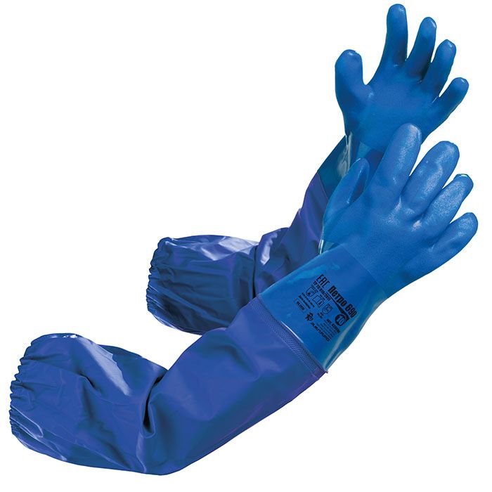 Перчатки из хлопчатобумажного трикотажа с припаянным нарукавником из модифицированного поливинилхлорида для защиты от механических воздействий, нефти, нефтепродуктов, минеральных масел, кислот и щелочей.