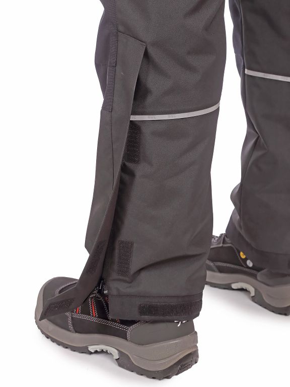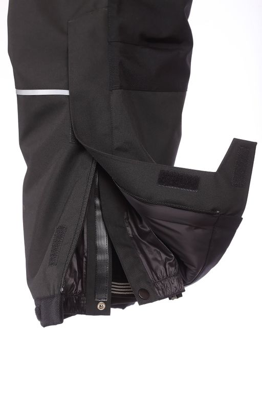 В нижней части имеется регулировка ширины брючин на молнии и липучке, внутренние гетры, предотвращающие попадание снега внутрь, а также световозвращающие элементы.