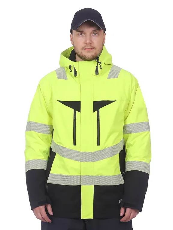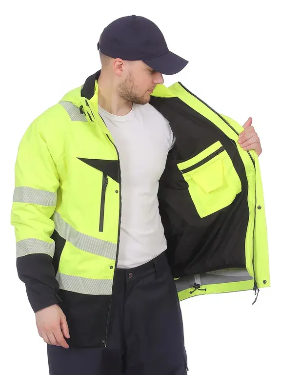 Ультралегкая сигнальная куртка с капюшоном из новейшего функционального материала, защищающего от влаги и ветра, со съемной утепляющей подкладкой, которая пристегивается на скрытую молнию, а также на петли с кнопками (точечно в трех местах, на спине и на рукавах) к куртке.