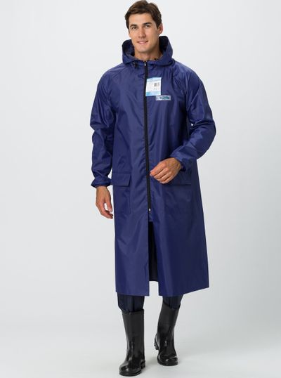 -удобная конструкция: плащ с застежкой на молнии, клапаном против ветра, капюшоном, двумя карманами с клапанами, манжетами на рукавах