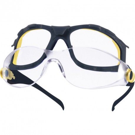 Очки из монолитного прозрачного поликарбоната. Интегрированное переносье. Регулируемые по углу наклона дужки из нейлона. Боковая защита. Съемная оправа для защиты от ударов и пыли.