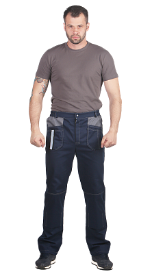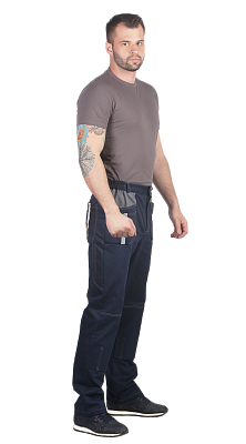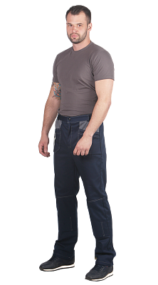 На уровне колена имеются усилительные накладки с карманами для защитных прокладок. Внешние срезы накладок уходят в боковые и шаговые швы.